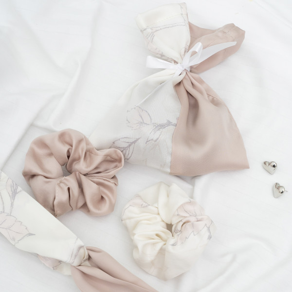 Все элементы набора изготовлены из ткани Tencel – 100% натурального волокна, созданного из целлюлозы эвкалиптовых деревьев. Эта ткань известна своей необычайной мягкостью, нежностью к коже, экологичностью и способностью дышать. Ее природные свойства делают Tencel идеальным материалом для повседневного использования, особенно в аксессуарах, контактирующих с кожей и волосами.