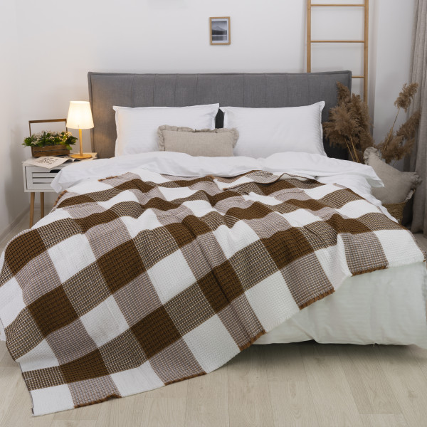 Покрывало жаккардовое клетчатое вафельное Коричневое 150х210